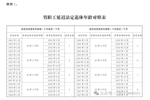 1.男職工延遲法定退休年齡對照表